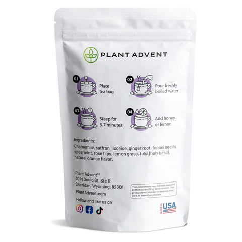 Ingredients: Chamomile, saffron, licorice, ginger root, fennel seeds, rosebuds/spearmint, rose hips, lemon grass, tulsi (holy basil) natural orange flavor.